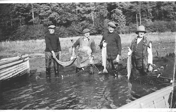 Fishermen holding salmon and nets in the River Tamar, at Cotehele.